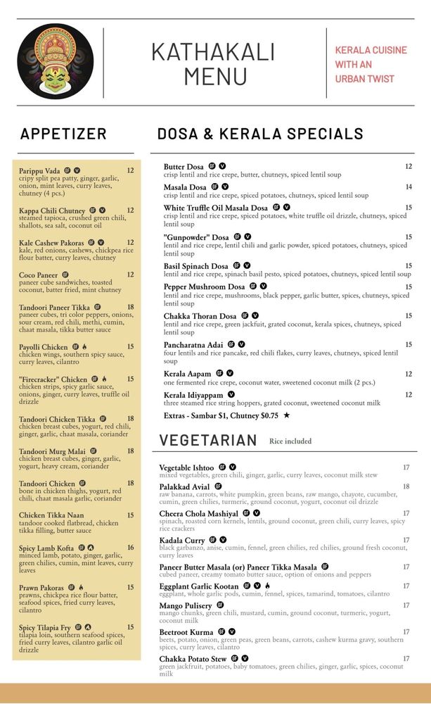 Kathakali, a seafood restaurant located in Kirkland, WA, offers a unique dining experience with a focus on South Indian cuisine. With a diverse menu featuring dosas, Kerala specials, vegetarian options, and small plates, Kathakali provides a range of flavorful dishes for everyone to enjoy. Customer reviews commend the restaurant for its attention to ingredients and authentic preparation methods. Standout dishes like the Basil Spinach Dosa and Chakka Potato Stew showcase the culinary expertise of the chefs. The cozy ambiance and welcoming staff add to the overall dining experience, making Kathakali a must-visit destination for lovers of Indian cuisine. Don't miss out on trying their signature dishes and exploring the rich flavors of South India at Kathakali.
